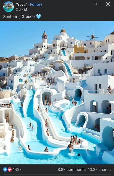 Μια σχετικά «αθώα» κατασκευή από πρόγραμμα Τεχνητής Νοημοσύνης εξαπάτησε εκατοντάδες χιλιάδες χρήστες του Facebook, που νομίζουν ότι στη Σαντορίνη υπάρχει κάτι σαν τη Βενετία, αλλά με πισίνα.