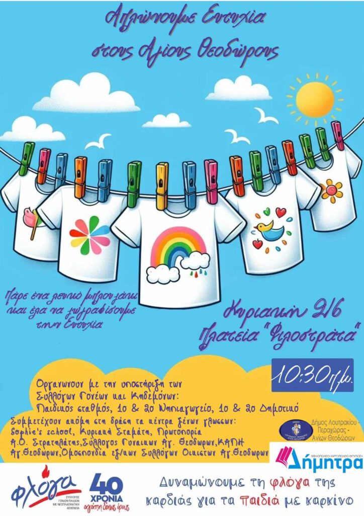 Απλώνουμε ευτυχία στους Αγίους Θεοδώρους: 2 June @ 08:00 – 17:00 | Πλατεία Φιλοστράτας, Άγιοι Θεόδωροι. ”Πάρε ένα λευκό μπλουζάκι και έλα να ζωγραφίσουμε την ευτυχία!” Μάθετε περισσότερα: https://loutraki.gov.gr/en/event/aplonoyme-eytychia-stoys-agioys-theodoroys/