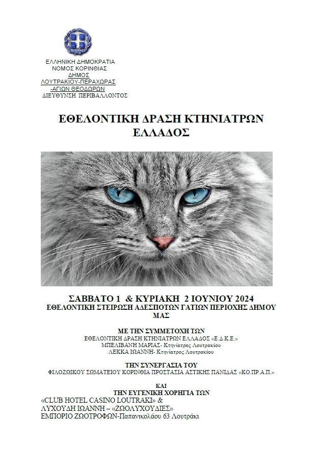 ΕΘΕΛΟΝΤΙΚΗ ΔΡΑΣΗ ΚΤΗΝΙΑΤΡΩΝ ΕΛΛΑΔΟΣ, 1 June @ 08:00 – 2 June @ 17:00 | Club Hotel Casino Loutraki. ΕΘΕΛΟΝΤΙΚΗ ΣΤΕΙΡΩΣΗ ΑΔΕΣΠΟΤΩΝ ΓΑΤΙΩΝ ΠΕΡΙΟΧΗΣ ΔΗΜΟΥ, Μάθετε περισσότερα: https://loutraki.gov.gr/en/event/ethelontiki-drasi-ktiniatron-ellados/