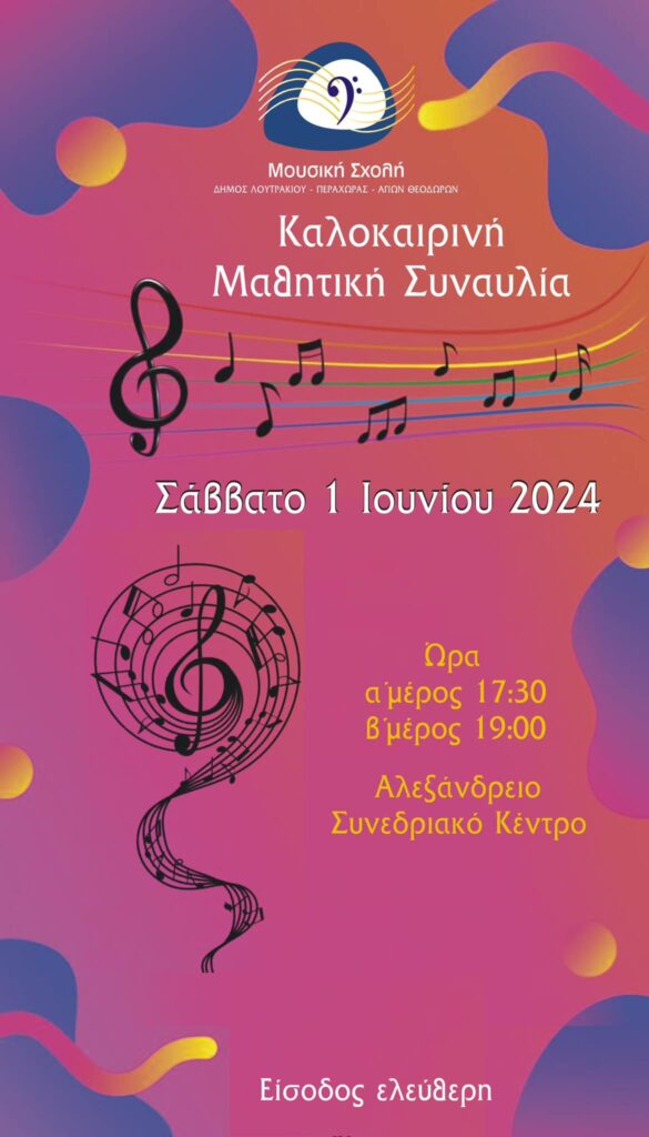 Καλοκαιρινή Μουσική Συναυλία, 1 June @ 17:30 – 21:00 | Αλεξάνδρειο Συνεδριακό Κέντρο. 𝚱𝚨𝚲𝚶𝚱𝚨𝚰𝚸𝚰𝚴𝚮 𝚳𝚶𝚼𝚺𝚰𝚱𝚮 𝚺𝚼𝚴𝚨𝚼𝚲𝚰𝚨 από την Μουσική Σχολή Λουτρακίου. Μάθετε περισσότερα: https://loutraki.gov.gr/en/event/kalokairini-moysiki-synaylia/