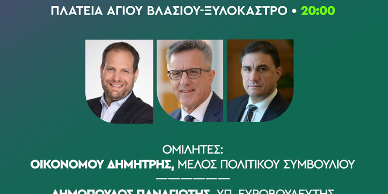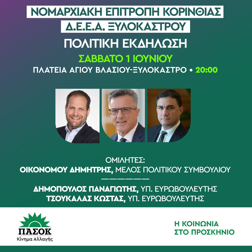 Πολιτική εκδήλωση θα πραγματοποιηθεί στο Ξυλόκαστρο το Σάββατο το απόγευμα 1/6 στις 20:00 στην κεντρική πλατεία Αγίου Βλασίου από την ΔΕΕΑ Ξυλοκάστρου – Ευρωστίνης.