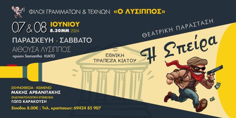 Η μεγάλη ανταπόκριση του κοινού για το θεατρικό έργο “Η Σπείρα” που ανέβηκε στο Κιάτο, υποχρέωσε του συντελεστές της να προσθέσουν μία ακόμα ημέρα στο ημερολόγιο των παραστάσεων. Έτσι, επειδή είχαν κλείσει όλες οι θέσεις για την παράσταση του Σαββάτου προστέθηκε, μία ακόμη παράσταση για την Παρασκευή 7 Ιουνίου. Όποιος έχει κλείσει για το Σάββατο μπορεί αν θέλει να αλλάξει με την Παρασκευή, αφού ενημερώσει εγκαίρως.