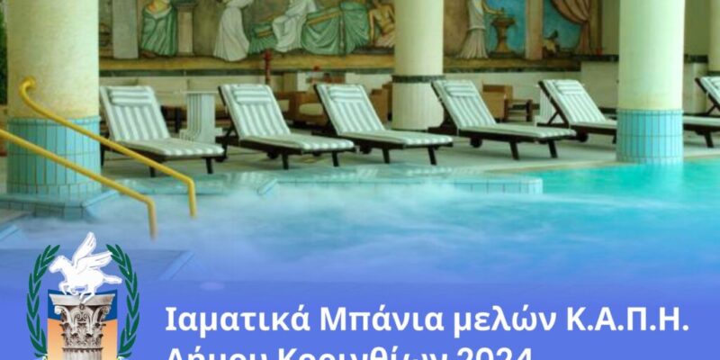 Ο Δήμος Κορινθίων με μοναδικό μέλημα την αναβάθμιση των παρεχόμενων υπηρεσιών προς τα μέλη των Κ.Α.Π.Η. ανακοινώνει την πραγματοποίηση των Ιαματικών μπάνιων στην Λουτρόπολη της Αιδηψού και φέτος.