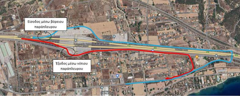 - η κυκλοφορία των οχημάτων με κατεύθυνση από Λουτράκι και Κόρινθο προς Καλαμάκι και Ίσθμια θα γίνεται μέσω προσωρινής εξόδου λίγο πριν το σταθμό διοδίων Ισθμού προς το νότιο παράπλευρο, που είναι η Παλαιά Εθνική Οδός «Αθηνών-Κορίνθου», όπως φαίνεται με την κόκκινη χάραξη στο παρακάτω σχηματικό διάγραμμα.