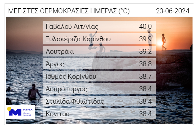 Πρόκειται για την Ξυλοκέριζα (39,9 βαθμοί), το Λουτράκι (39.2) και τον Ισθμό 38,7! Όπως αναφέρει χαρακτηριστικά το άρθρο του ΜΕΤΕΟ, “σύμφωνα με το δίκτυο αυτόματων μετεωρολογικών σταθμών του meteo.gr / Εθνικού Αστεροσκοπείου Αθηνών υψηλές θερμοκρασίες καταγράφηκαν στα ηπειρωτικά και την Κυριακή 23/06. Η υψηλότερη θερμοκρασία καταγράφηκε στη Γαβαλού Αιτωλοακαρνανίας και ήταν ίση με 40.0 °C. Στο παρακάτω πίνακα παρουσιάζονται οι οκτώ υψηλότερες μέγιστες θερμοκρασίες που καταγράφηκαν την Κυριακή 23/06 έως τις 17:00...”