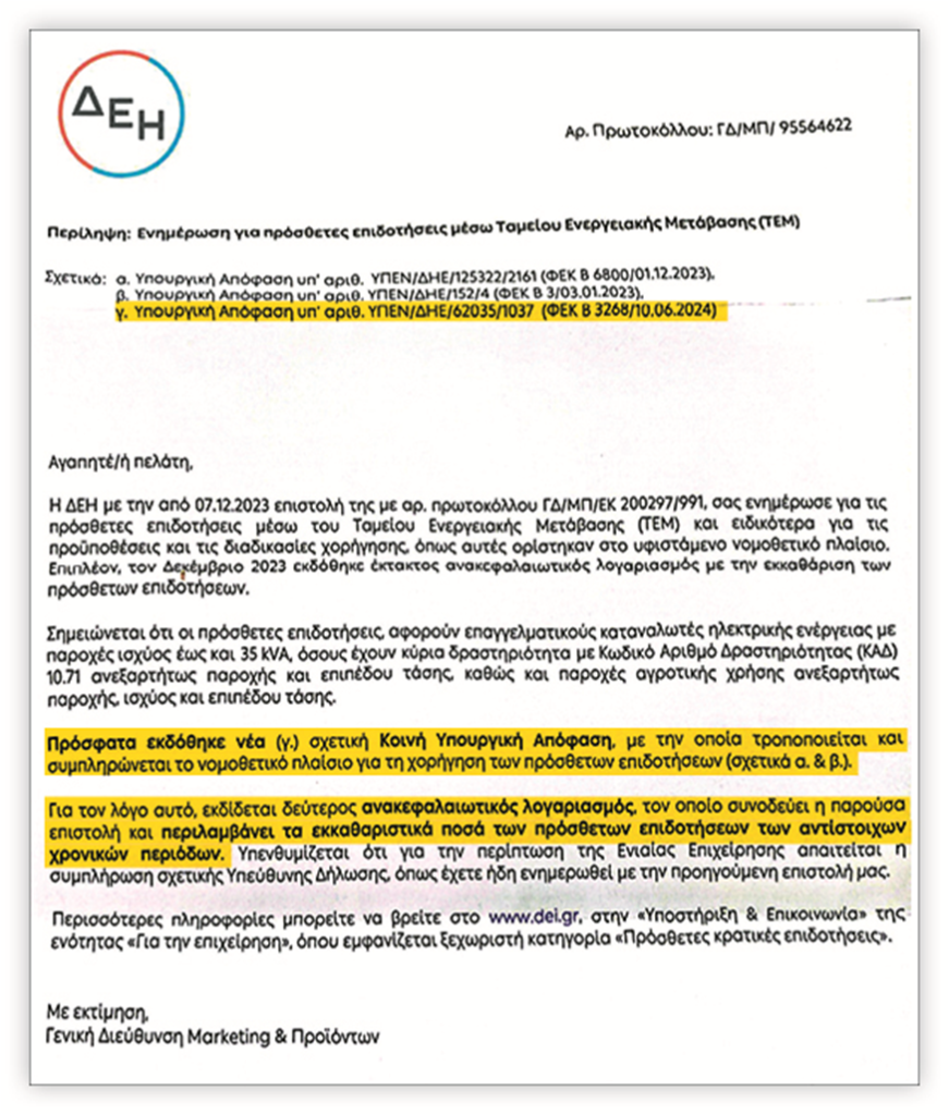 Με την ένδειξη «Ειδικό Τιμολόγιο» και «Έκτακτος Λογαριασμός» πάροχοι ηλεκτρικού ρεύματος όπως η ΔΕΗ ζητούν την επιστροφή των πρόσθετων επιδοτήσεων που υπέγραψαν Κυρ. Μητσοτάκης, Κ. Χατζηδάκης και Θεοδ. Σκυλακάκης.