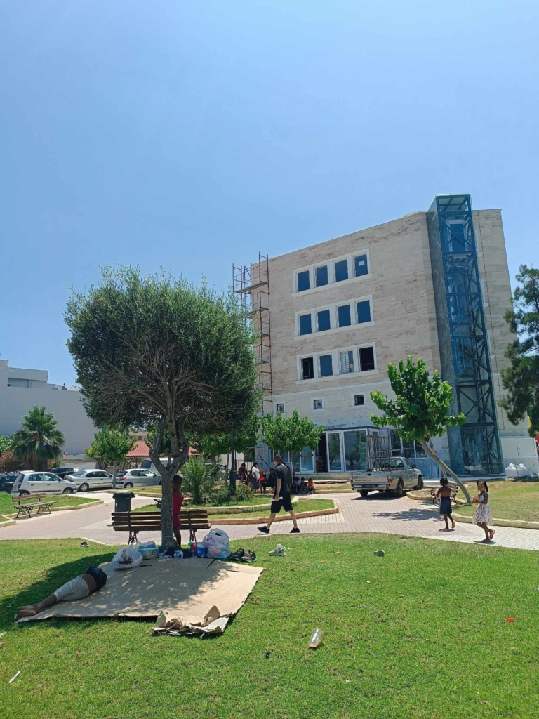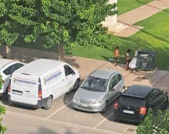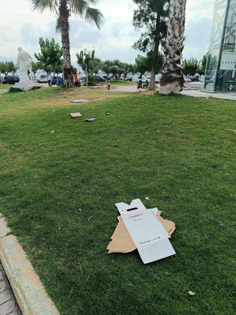 Σάπιες ντομάτες, απλώστρες στο γκαζόν, σκουπίδια και χαρτόνια παντού, την ίδια ώρα που μικρά τσιγγανάκια, αντί επαιτείας, “εργάζονται” υποδεικνύοντας κενές θέσεις στάθμευσης στο πάρκινγκ του Αγίου Νικολάου.