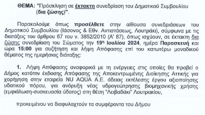 Σε εξέλιξη είναι αυτή την ώρα έκτακτη συνεδρίαση του Δημοτικού Συμβουλίου Λουτρακίου με μοναδικό θέμα την αδειοδότηση που πήρε η NU AQUA, η εταιρεία που εμπορεύεται το νερό του Λουτρακίου (ΕΟΝΙΟ LOUTRAKI), σε μία περίοδο που ολόκληρες περιοχές του δήμου είναι άνυδρες!