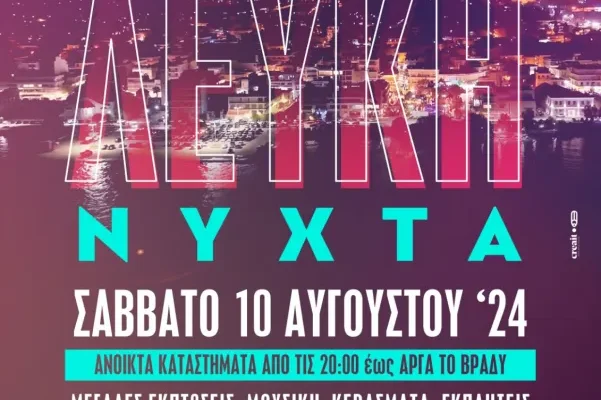 Αυτό δεν σημαίνει πως δεν έχουμε κι εμείς τις Λευκές Νύχτες μας. Μπορεί να μην είναι ένα φυσικό φαινόμενο γίνεται, όμως, μια αφορμή για να γιορτάσουμε τον Αύγουστο, τον πιο όμορφο μήνα του χρόνου. Γι αυτό όπως κάθε χρόνο, έτσι και φέτος, τα καταστήματα της πόλης μας θα μείνουν ανοιχτά για ένα βράδυ, το βράδυ του ερχόμενου Σαββάτου 10 Αυγούστου, από την δύση του ηλίου μέχρι …όποτε!