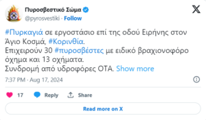 Μέσα σε μία ώρα τέθηκε υπό έλεγχο η φωτιά που ξέσπασε περίπου στις 7 το απόγευμα σε εργοστάσιο εκκλησιαστικών ειδών (κατασκευάζει καρβουνάκια), στην περιοχή Άγιος Κοσμάς, μεταξύ Εξαμιλίων και Κυρα Βρύσης, στην άτυπη βιομηχανική ζώνη της Κορίνθου.