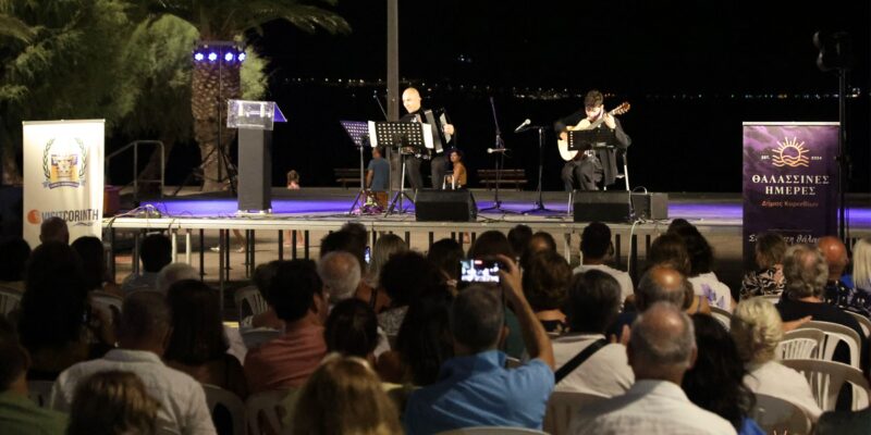 Παραφράζοντας την γνωστή παροιμία, θα μπορούσε να πει κανείς ότι «οι καλές “Θαλασσινές Ημέρες” από την τελετή έναρξης φαίνονται». Και είναι αλήθεια ότι η σπουδαία μουσική παράσταση που έδωσαν ο Κορίνθιος κλασικός κιθαρίστας, Δημήτρης Σουκαράς, μαζί με τον φημισμένο σολίστα του Bandoneon και του Accordion, Mario Stefano Pietrodarchi, χτες (Δευτέρα) το βράδυ, στην πλατεία του Φλοίσβου, ήταν ό,τι το καλύτερο για να ξεκινήσει η μεγάλη γιορτή που γίνεται φέτος για πρώτη φορά από τον Δήμο Κορινθίων.