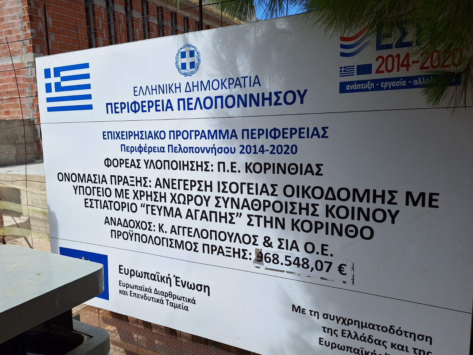 Το δεύτερο έργο περιλαμβάνει την ανέγερση ισόγειας οικοδομής με υπόγειο στην Κόρινθο, η οποία θα χρησιμοποιηθεί ως χώρος συνάθροισης κοινού και εστιατόριο «Γεύμα Αγάπης», που θα εξυπηρετεί ευάλωτες κοινωνικές ομάδες.