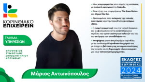 Θελουμε να ανοίξουμε τις πόρτες  στο  ΕΠΙΜΕΛΗΤΗΡΙΟ ΚΟΡΙΝΘΙΑΣ και να βάλουμε τα θεμέλια σε μια νέα εποχή εξωστρέφειας.” σημείωσε ο υποψήφιος πρόεδρος υπογραμμίζοντας πως για το “ΚΟΡΙΝΘΙΑΚΟ ΕΠΙΧΕΙΡΕΙΝ” η εποχή της εξωστρέφειας αφορά κυρίως τα μέλη του  και όχι τον “πολυπαραγοντισμό.”