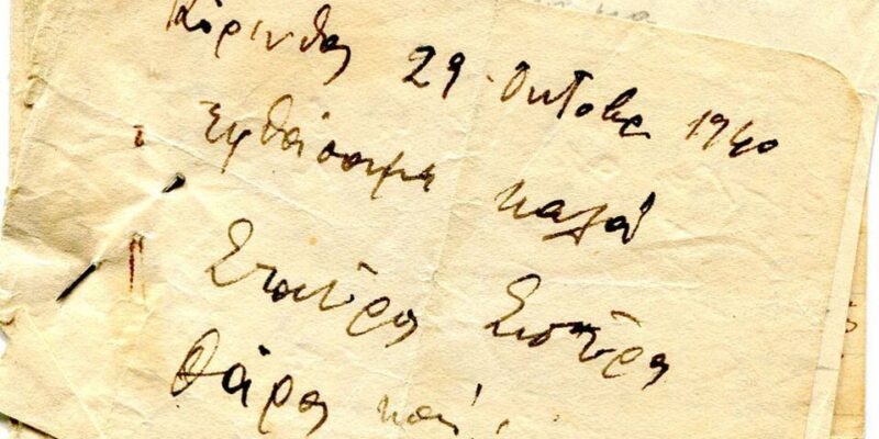 “Θάρος και υπομονή” συνιστούσαν στα μετόπισθεν ο Σταύρος και ο Σπύρος, δύο αδέρφια επιστρατευμένα. Γράφουν την επομένη της 28ης Οκτωβρίου 1940 από την Κόρινθο στην πορεία τους προς το Μέτωπο. Τα ανέκδοτα γράμματά τους, μαζί με άλλων, εντοπίστηκαν πριν από μερικά χρόνια ανάμεσα στις σελίδες ενός παλαιού βιβλίου. (Αρχείο Γιώργου Λεβούνη)