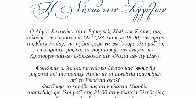 ΕΠΙΚΑΙΡΟΤΗΤΑ Η Νύχτα των Αγγέλων στο Κιάτο στις 29 Νοεμβρίου By KORINTHIA.NET.GR.2 18/November/2024 ShareTweet 0 Πρόσκληση για μια διαφορετική νύχτα, τη Νύχτα των Αγγέλων στέλνει ο Εμπορικός Σύλλογος Κιάτου, για την Παρασκευή 29 Νοεμβρίου 2024 και ώρα 18:00, την ημέρα της Black Friday.