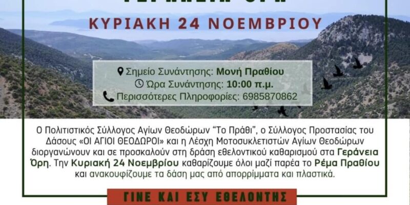 Ο Πολιτιστικός Σύλλογος Αγίων Θεοδώρων “Το Πράθι”, ο Σύλλογος Προστασίας του Δάσους «ΟΙ ΑΓΙΟΙ ΘΕΟΔΩΡΟΙ» και η Λέσχη Μοτοσυκλετιστών Αγίων Θεοδώρων σε συνεργασία με τον Δήμο Λουτρακίου – Περαχώρας – Αγίων Θεοδώρων, σας προσκαλούν να συμμετάσχετε σε μια δράση εθελοντικού καθαρισμού στα πανέμορφα Γεράνεια Όρη!