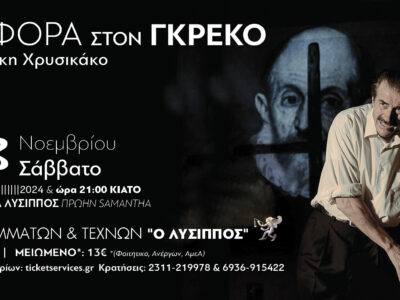 Το Σάββατο 23 Νοεμβρίου ο Τάκης Χρυσικάκος θα βρίσκεται στο Κιάτο, στην αίθουσα του Πολιτιστικού Συλλόγου “Λύσιππος” με την παράσταση «Αναφορά στον Γκρέκο». ...