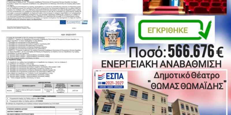Την έγκριση πέντε δράσεων που θα οδηγήσουν στην ενεργειακή αναβάθμιση του Δημοτικού Θεάτρου πέτυχε ο Δήμος Κορινθίων, μέσα από χρηματοδότηση στο πρόγραμμα «Περιβάλλον και Κλιματική Αλλαγή». Πρόκειται για δράσεις (προϋπολογισμού 566.676 ευρώ) που δημιουργούν ένα ολοκληρωμένο σύμπλεγμα υψηλής ενεργειακής απόδοσης, με σημαντικό περιβαλλοντικό αποτύπωμα.