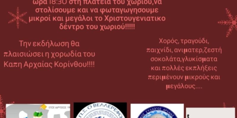 To Χριστουγεννιάτικο Δέντρο της Αρχαίας Κορίνθου θα στολίσει σήμερα η Τοπική Κοινότητα και όλοι οι τοπικοί σύλλογοι. Η φωταγώγηση θα γίνει στις 6.30 στην πλατεία του χωριού