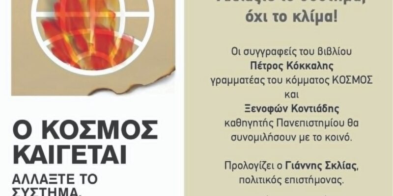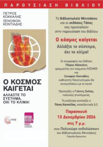Γι’ αυτό και η παρουσίαση του βιβλίου των Πέτρου Κόκκαλη & Ξενοφώντα Κοντιάδη “Ο κόσμος καίγεται” την Παρασκευή 13/12/2024 στις 19.00 στον Πολυχώρο εκδηλώσεων του βιβλιοπωλείου Μπιτσάκου στην παραλία Βραχατίου, είναι επίκαιρη και ιδιαίτερης σημασίας.