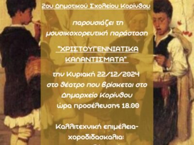 Την Κυριακή 22 Δεκεμβρίου ο Σύλλογος Γονέων 2ου Δημοτικού Σχολείου Κορίνθου παρουσιάζει τη μουσικό-χορευτική παράσταση “Χριστουγεννιάτικα Καλαντίσματα”, στο θεατράκι του δημαρχείου Κορίνθου ώρα ...