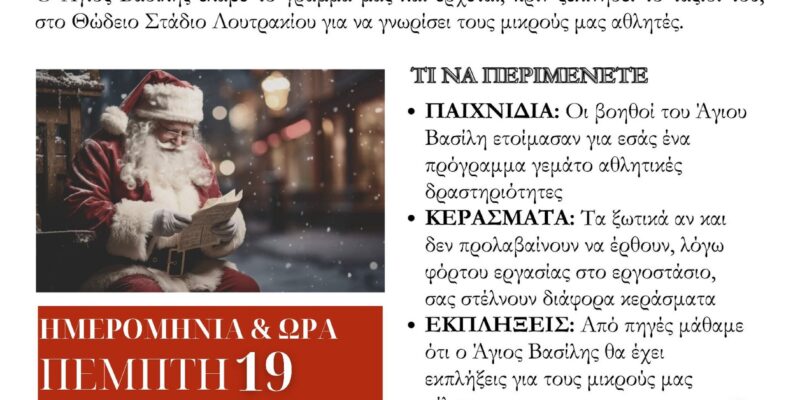 Την Πέμπτη 19/12, ο αγαπημένος Άγιος όλων μας, ο Άγιος Βασίλης έρχεται στο Στίβο, στις 17.00 στο Θώδειο Στάδιο Λουτρακίου. Μην το ξεχάσετε! Πολλές εκπλήξεις, παιχνίδια, μουσική, κεράσματα και πολλές πολλές ευχές από την μεγάλη οικογένεια του Στίβου του Α.Ο. Ποσειδών Λουτρακίου.