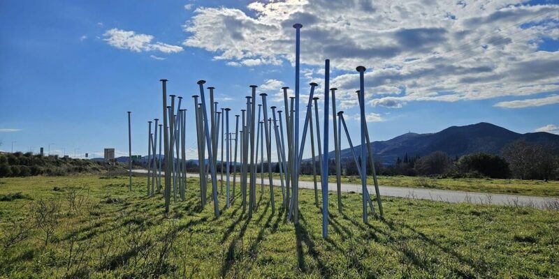 Το έργο «58 καρφιά στα Τέμπη» αποτελούνταν από 58 μεταλλικούς σωλήνες ύψους 2-2,5 μέτρων.