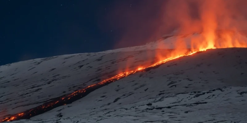 Η πρόσφατη έκρηξη της Αίτνας δημιούργησε ένα εντυπωσιακό φαινόμενο, όπου η λάβα συναντήθηκε με το χιόνι που κάλυπτε τις πλαγιές του ηφαιστείου.