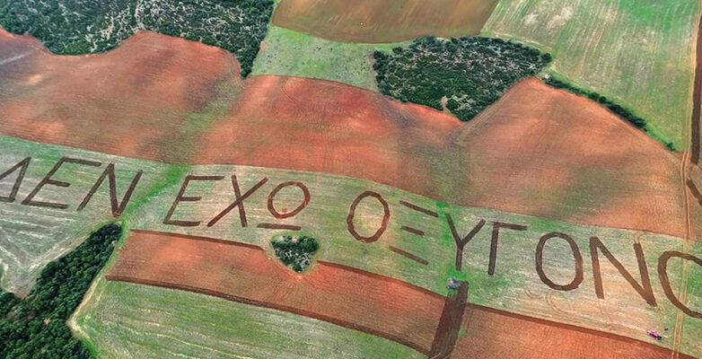 Ο Κριστιάν Ρούτσι και ο φίλος του, αγρότης στο επάγγελμα, έγραψαν με τρακτέρ τη φράση που έχει συγκλονίσει το πανελλήνιο σε ένα χωράφι έκτασης περίπου 100 στρεμμάτων, όπως μετέδωσε το Focus FM 103,6.