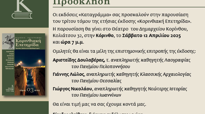 Με πλούσια ύλη κυκλοφόρησε ο 3ος τόμος (2024) του επιστημονικού περιοδικού «ΚΟΡΙΝΘΙΑΚΗ ΕΠΕΤΗΡΙΔΑ Έρευνας, Μελέτης και Προβληματισμού», από τις Εκδόσεις ΚΑΤΑΓΡΑΜΜΑ (Αφοί Τερζή).