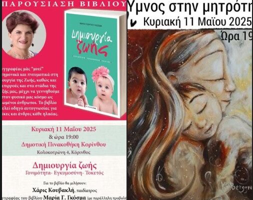 Η Διεύθυνση Πολιτισμού Δήμου Κορινθίων, τιμώντας τη Γιορτή της Μητέρας, οργανώνει μια ξεχωριστή εκδήλωση την Κυριακή 11 Μαΐου 2025 στις 7:00μμ, αφιερωμένη σε όλες τις μητέρες του κόσμου και τον καθοριστικό ρόλο που διαδραματίζουν στη ζωή και τη διαμόρφωση του χαρακτήρα των παιδιών.Η μαία Μαρία Γκόσμα, με πολυετή εμπειρία στο πλευρό των γυναικών που φέρνουν ζωή στον κόσμο, θα παρουσιάσει το βιβλίο της με τίτλο “Δημιουργία Ζωής”, μια συγκινητική και βαθιά κατάθεση ψυχής για το θαύμα της ζωής και τα στάδια της εξέλιξής μας, μέχρι να εκδηλωθούμε εδώ στον φυσικό μας κόσμο, ως τελειωμένοι άνθρωποι. Το βιβλίο αποτελεί οδηγό αυτογνωσίας για γυναίκες και άνδρες όλων των ηλικιών. Για το βιβλίο θα μιλήσει η παιδίατρος Χάρις Κουβακλή. Θα συντονίσει η Τονια Τζαναβαρα , προϊσταμένη της Διεύθυνσης Πολιτισμού Δ.Κορινθιων.