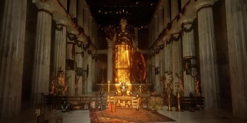 «Φανταστείτε να μπαίνετε στον Παρθενώνα-τα μάτια σας, ακόμα κουρασμένα από το εκτυφλωτικό φως του ήλιου έξω, προσαρμόζονται σιγά-σιγά στο σκοτάδι του εσωτερικού», περιγράφει ο de Lara. «Καθώς το ηλιακό φως φιλτράρεται από την είσοδο του ναού, χτυπά το χρυσό των ενδυμάτων της θεάς με μια κατακόρυφη, λαμπερή δέσμη. Αυτό ακριβώς το εφέ ήθελαν να δημιουργήσουν οι αρχιτέκτονες και ο Φειδίας. Πρέπει να ήταν μαγευτικό!».