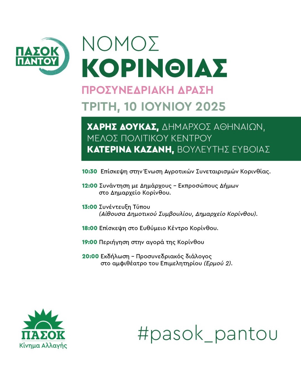 Την Τρίτη 10 Ιουνίου 2025, Κλιμάκιο του ΠΑΣΟΚ – Κινήματος Αλλαγής με επικεφαλής τον Δήμαρχο Αθηναίων και Μέλος του Συντονιστικού Πολιτικού Κέντρου Χάρη Δούκα, θα πραγματοποιήσει συναντήσεις στην Κόρινθο, στο πλαίσιο των προσυνεδριακών δράσεων για το Περιφερειακό Συνέδριο Πελοποννήσου του ΠΑΣΟΚ – Κινήματος Αλλαγής.