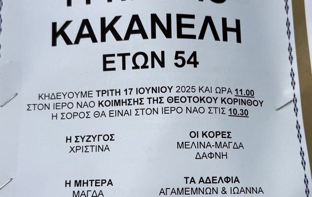 Η κηδεία του Γρηγόρη Κακανέλη θα γίνει αύριο Τρίτη, στις στην Κόρινθο.