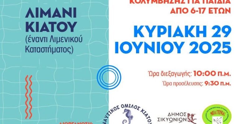 Ο Ναυτικός Όμιλος Κιάτου ανακοινώνει με χαρά τη διεξαγωγή αγώνων επίδειξης κολύμβησης για παιδιά ηλικίας 6 έως 17 ετών, την Κυριακή 29 Ιουνίου 2025, στο λιμάνι του Κιάτου (έναντι του Λιμενικού Καταστήματος), στο πλαίσιο της φετινής Ναυτικής Εβδομάδας.