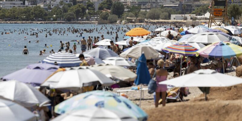A general view of a crowded beach at Varkiza suburb, south of Athens, Greece, on Sunday, July 14, 2024. Greek authorities have warned of an impending weeklong heat wave during the summer tourist season, with a high risk of dangerous wildfire. The new heat wave comes on the heels of the hottest June on record in Greece. (AP Photo/Yorgos Karahalis)