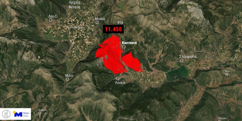 Σύμφωνα με την ανάλυση των δορυφορικών δεδομένων του ευρωπαϊκού μηχανισμού Copernicus EMS, έως και τις 12:23 της Τρίτης είχαν καεί περίπου 11.450 στρέμματα δασικών και χορτολιβαδικών εκτάσεων στις περιοχές μεταξύ Καστανιάς, Λάυκας, Μοσιάς και Οροπεδίου Φενεού.