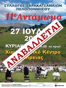 Με αίσθημα ευθύνης, σας ενημερώνουμε ότι το Αντάμωμα των Σαρακατσαναίων Πελοποννήσου αναβάλλεται, λόγω των πρόσφατων τραγικών γεγονότων που έπληξαν την Ορεινή Κορινθία, προκαλώντας εκτεταμένες καταστροφές στο φυσικό περιβάλλον και την τοπική κοινωνία.