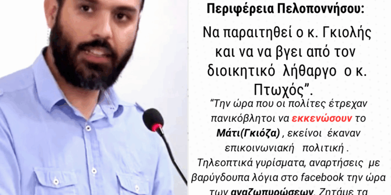 - Ο Περιφερειάρχης Πελοποννήσου κ. Πτωχός οφείλει να βγει από τον διοικητικό λήθαργο, να σταματήσει να «στοχάζεται» πάνω από τις στάχτες και να αναλάβει την πολιτική του ευθύνη. Οι “ολιστικές προσεγγίσεις” δεν σβήνουν φωτιές.