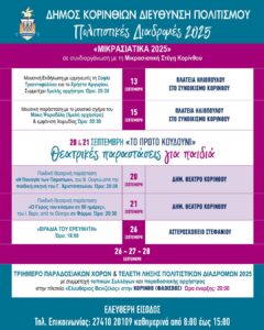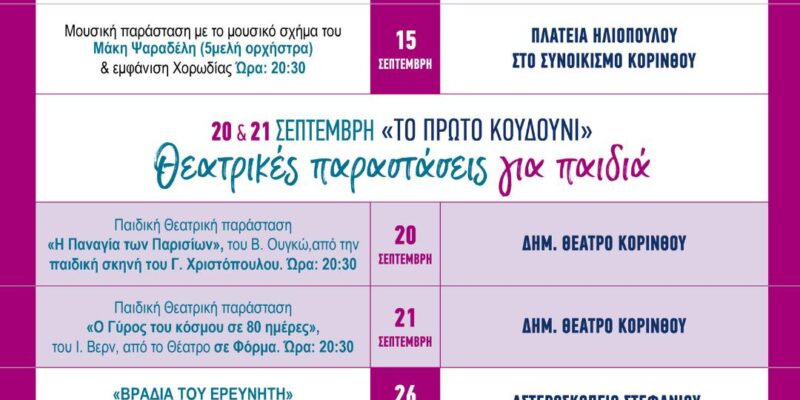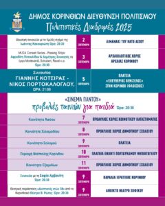 Όλο το καλοκαίρι ταξιδέψαμε μαζί σε μουσικές, θεατρικές και κινηματογραφικές βραδιές σε πλατείες, παραλίες, αρχαιολογικούς χώρους και γειτονιές του Δήμου Κορινθίων. Τώρα, ο Σεπτέμβρης φέρνει το τελευταίο, αλλά πιο δυναμικό κεφάλαιο των Πολιτιστικών Διαδρομών:
