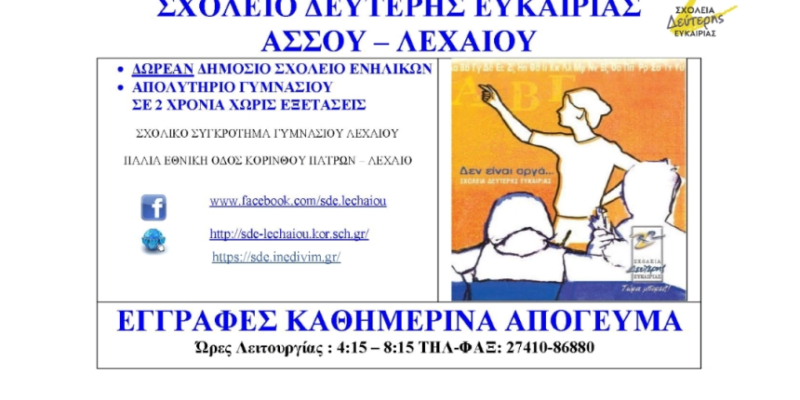Σχολείο δεύτερης ευκαιρίας Άσσου – Λεχαίου: Ξεκίνησαν οι εγγραφές για το νέο σχολικό έτος