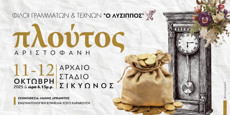 Οι Φίλοι Γραμμάτων και Τεχνών “Ο Λύσιππος” παρουσιάζουν το διαχρονικό έργο του Αριστοφάνη «Πλούτος», σε σκηνοθεσία του Μάκη Αρβανίτη, το Σάββατο 11 και την Κυριακή 12 Οκτωβρίου 2025, στις 6:15 μ.μ., στο μαγευτικό Αρχαίο Στάδιο Σικυώνος.