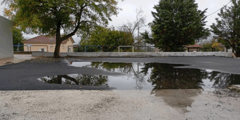 Σύμφωνα με μήνυμα κατοίκου της περιοχής στο sfedona.gr, ο Δήμος Σικυωνίων προχώρησε πρόσφατα σε μια μικρή παρέμβαση στο σχολείο, ρίχνοντας πίσσα σε ένα τμήμα του προαυλίου. Ωστόσο, όπως αποδείχτηκε, η εργασία έγινε τόσο πρόχειρα και χωρίς σωστή υποδομή, που μόλις έβρεξε, το “μπάλωμα” μετατράπηκε σε ρηχή λιμνούλα, ιδανική, όπως σχολιάζουν οι γονείς με πικρό χιούμορ, “για να παίζουν τα παιδιά με παπάκια και καραβάκια”.