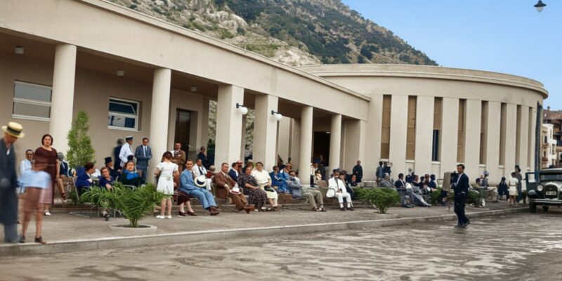 H κατασκευή της Ιαματικής Πηγής Λουτρακίου πραγματοποιήθηκε το 1921 και ολοκληρώθηκε με τη σημερινή της μορφή το 1934. Η δομή του επιβλητικού κυκλικού κτιρίου της Πηγής είναι απλή και λιτή.