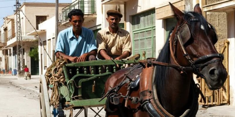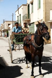 Στην οδό Δαμασκηνού, τη δεκαετία του 1950. Αριστερά ο Γιάννης Μαυραγάνης κι’ απ’ ότι είχε γράψει η κόρη του Κατερίνα, το άλογο του το είχαν στείλει οι θείοι της, από την Αμερική!