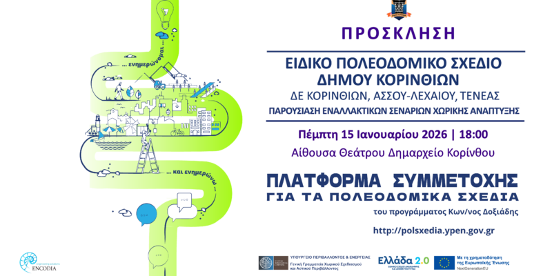 Η εκδήλωση θα πραγματοποιηθεί την Πέμπτη 15 Ιανουαρίου, και ώρα 18:00, στην Αίθουσα του Θεάτρου του Δημαρχείου Κορινθίων (Κολιάτσου 32, Κόρινθος), με στόχο την ενημέρωση και ενεργή συμμετοχή των πολιτών, των τοπικών φορέων και των επαγγελματιών της περιοχής στη διαμόρφωση του τελικού σχεδιασμού.