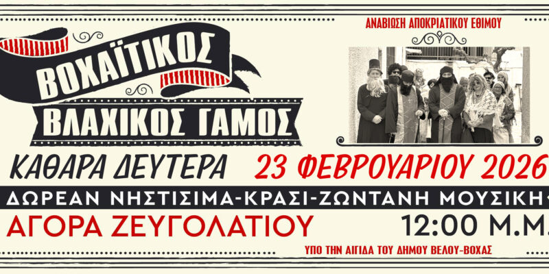 Την Καθαρά Δευτέρα 23 Φεβρουαρίου 2026 θα αναβιώσει το αποκριάτικο έθιμο ο Βοχαΐτικος Βλάχικος Γάμος στο Ζευγολατιό Κορινθίας.
