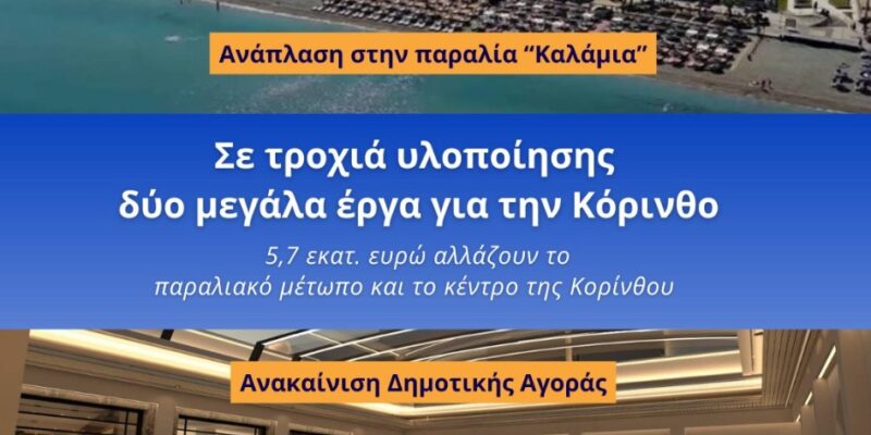 Δύο σημαντικές παρεμβάσεις που αναμένεται να αλλάξουν την εικόνα τόσο του παραλιακού μετώπου όσο και του ιστορικού κέντρου της Κορίνθου προωθεί ο Δήμος Κορινθίων, μετά την ολοκλήρωση της υποβολής των πλήρων φακέλων χρηματοδότησης για την ανάπλαση της παραλίας «Καλάμια» και την ανακαίνιση της Δημοτικής Αγοράς.