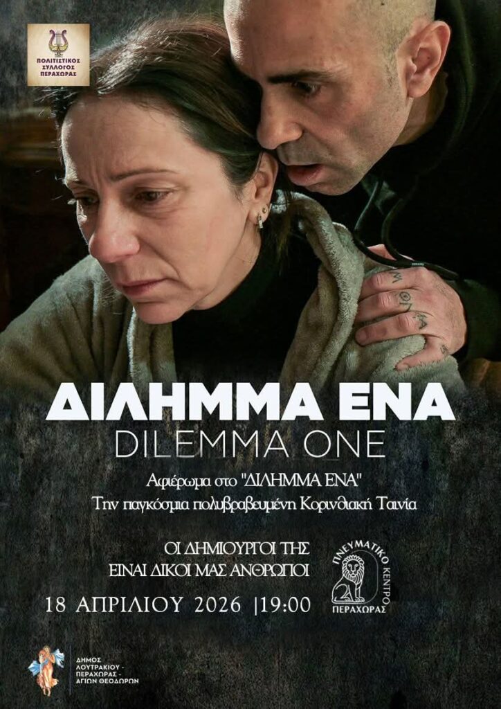 Ένα ξεχωριστό πολιτιστικό γεγονός φιλοξενείται στις 17 Απριλίου και ώρα 19:00, στο Πνευματικό Κέντρο Λουτρακίου, με ένα αφιέρωμα βασισμένο στην πολυβραβευμένη ταινία μικρού μήκους της Μαρία Φραγκιά, “ΔΙΛΗΜΜΑ ΕΝΑ”, η οποία έχει καταφέρει να αποσπάσει σημαντικές διεθνείς διακρίσεις και να συμμετάσχει σε αξιόλογα φεστιβάλ κινηματογράφου ανά τον κόσμο.