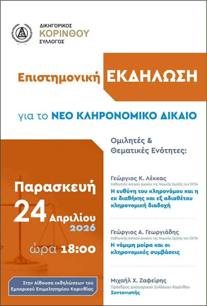 Ο Δικηγορικός Σύλλογος Κορίνθου διοργανώνει επιστημονική εκδήλωση με θέμα το νέο Κληρονομικό Δίκαιο, την Παρασκευή 24 Απριλίου 2026 και ώρα 18:00, στο Αμφιθέατρο του Επιμελητηρίου Κορινθίας «Γιάννης Λαρσινός».